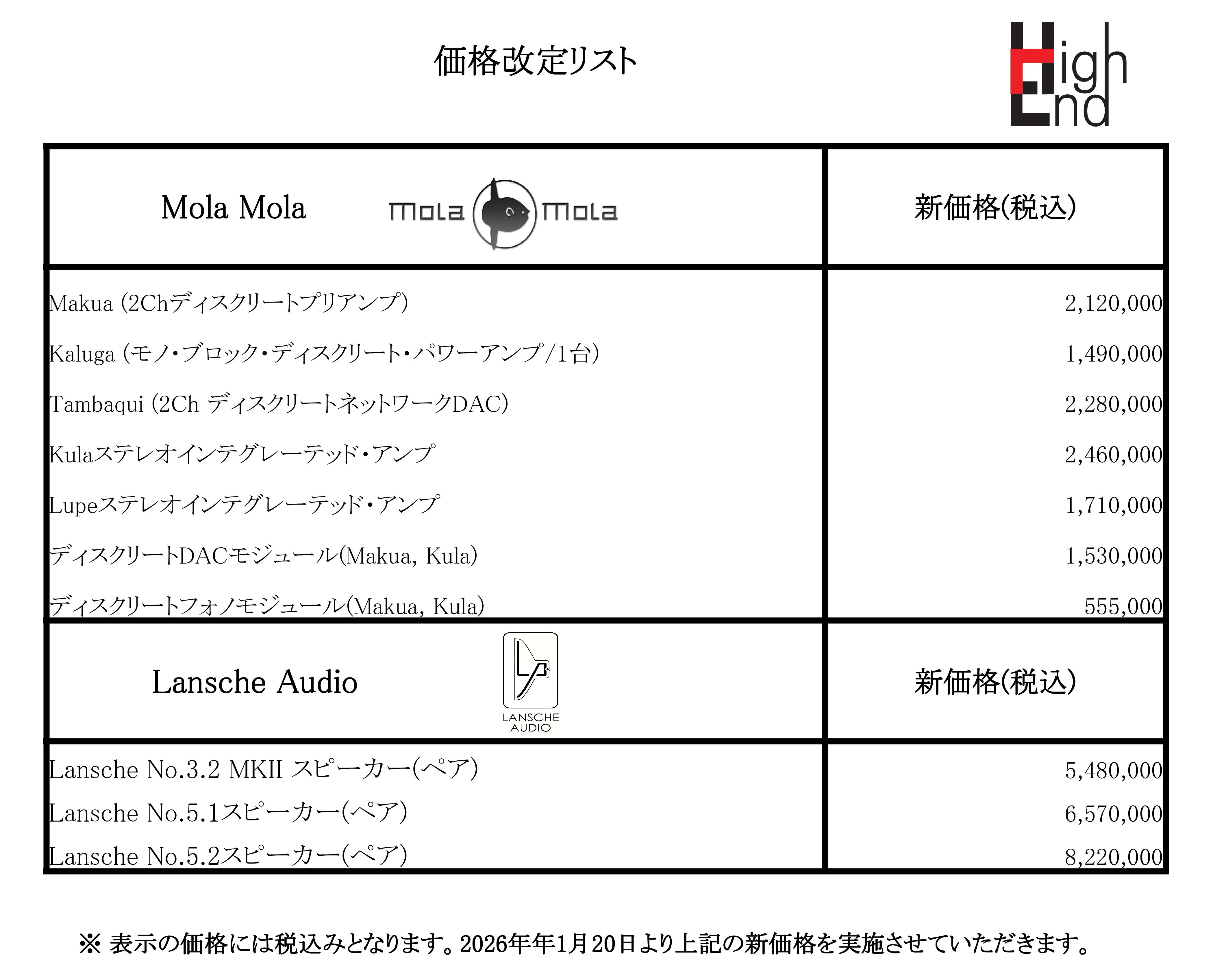 時下益々ご清栄のこととお慶び申し上げます。 弊社取り扱いMola Mola、Lansche Audio製品におきまして、円安・ユーロ高の亢進、 今後もよりご満足いただける高品質な製品やサービスをご提供できるよう努めてまいります。
